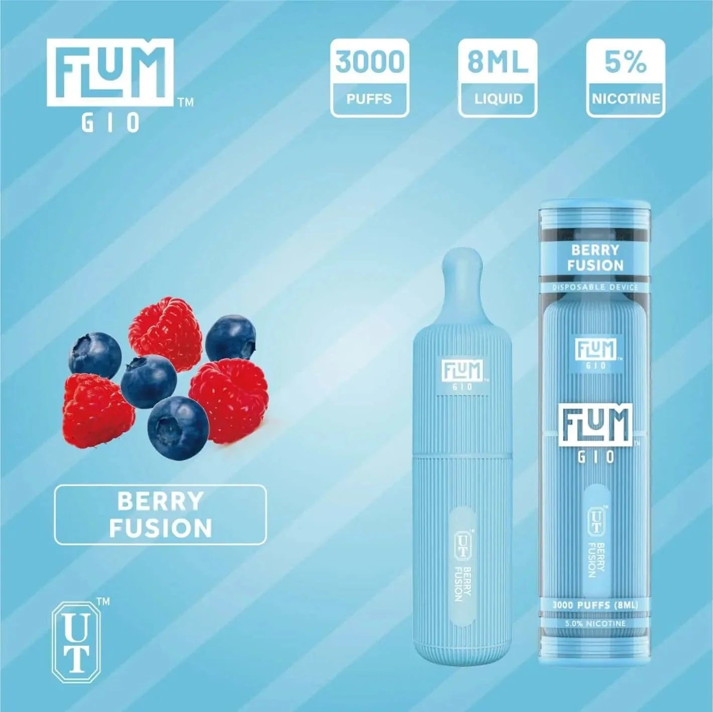 With an ejuice capacity of 8ml and 5% of nicotine, the Flum Gio Berry Fusion disposable vaporizer delivers approximately 3000 puffs in a compact, light, and portable design.